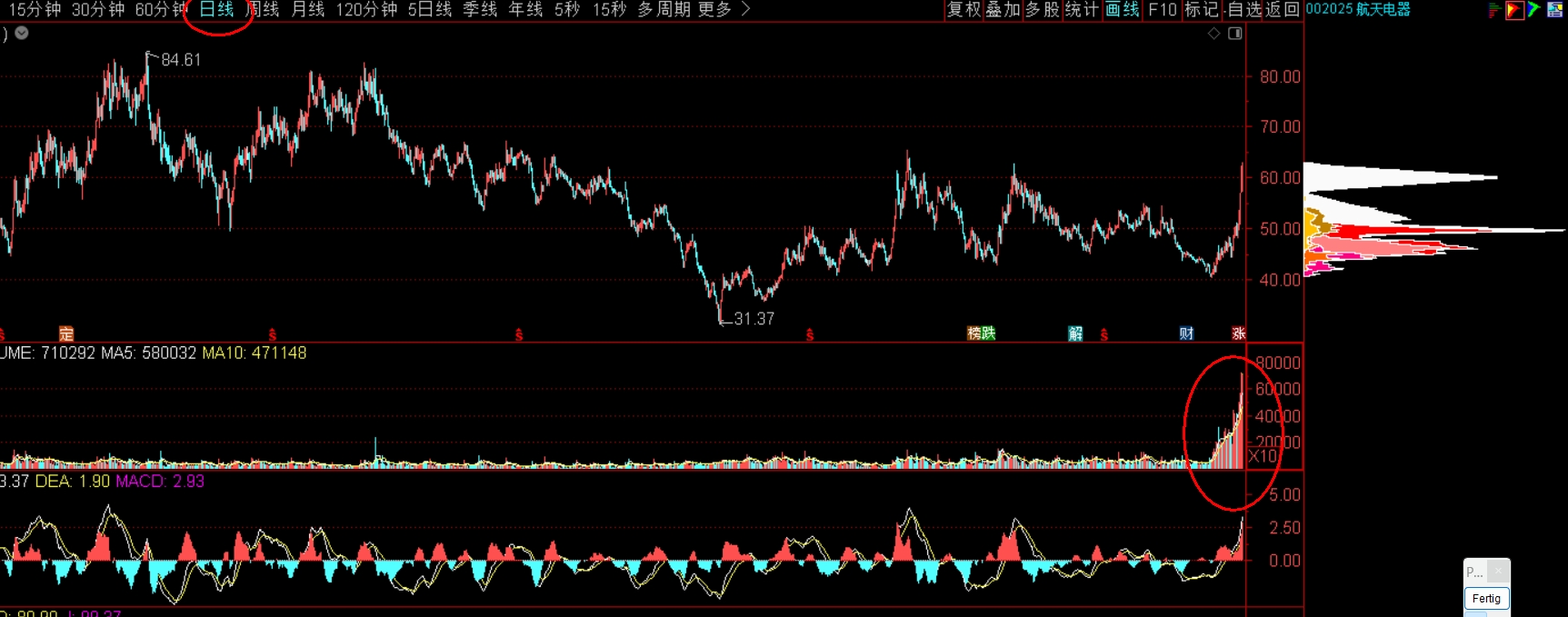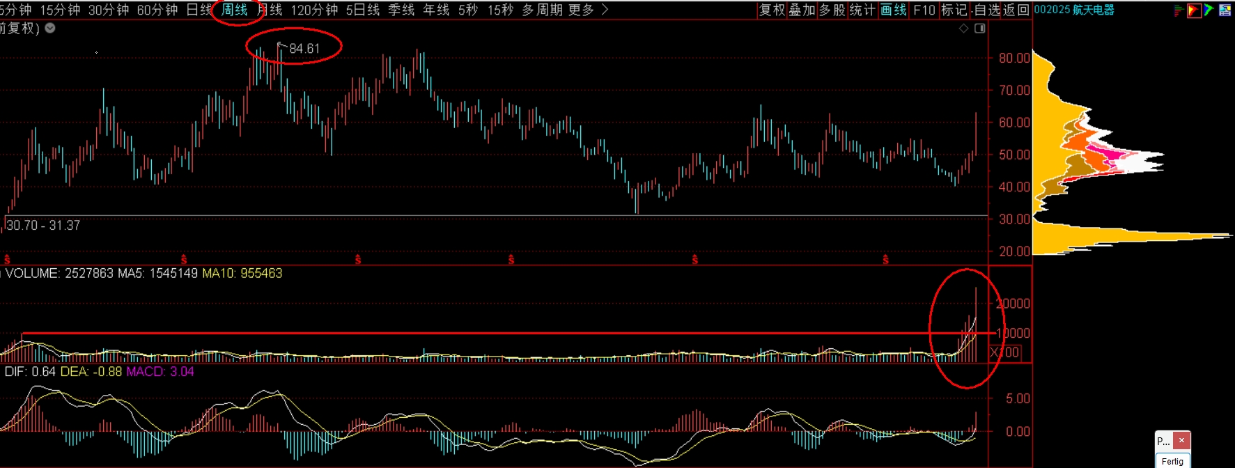 图形相对商业航天板块,相对低位且量能非常完美,属于底部放历史巨量。(如图日线、周线)