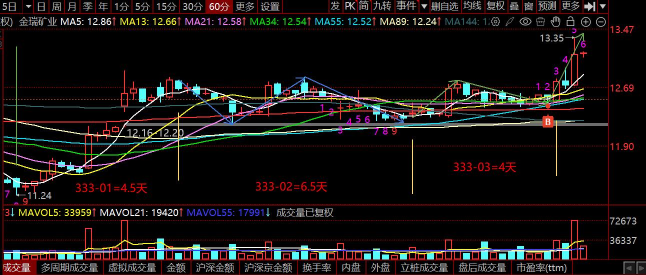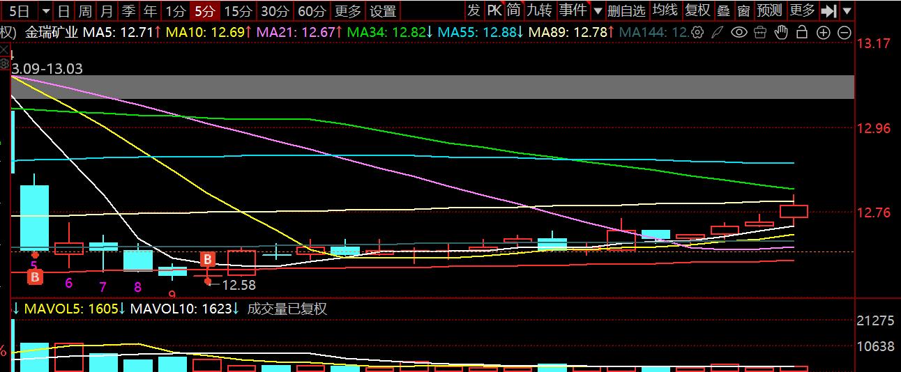 333-03浪走完了第1波上升、第2波下跌,上午尾盘已经有大单抢筹。上午在5分钟MA233止跌受到支撑,下午开始走第3波上升,站上5分钟MA55=12.87向上趋势就稳了。