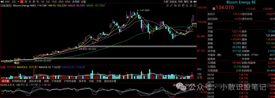 对标的美股公司叫Bloom Energy (BE),是美股SOFC(固体氧化物燃料电池)龙头,受益于AI缺电逻辑,2025年大涨,调整了一段时间,前天上涨了10+%,那么映射到咱们这边能不能做个套利呢?