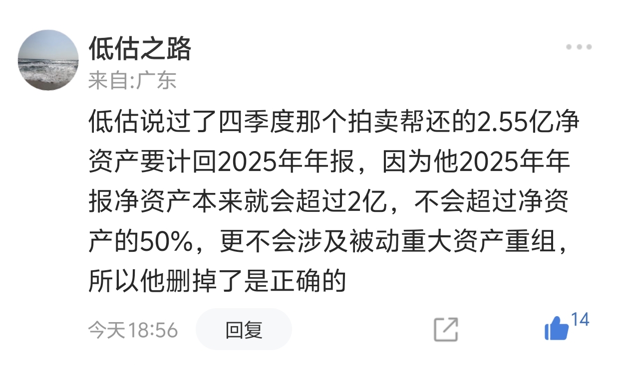 回复楼下的净资产问题,上次董秘发公告说拍卖康平铁科会被动导致重大资产重组,后来董秘修改了公告,撤回了被动重大资产重组的表述,低估的分析是对的。
