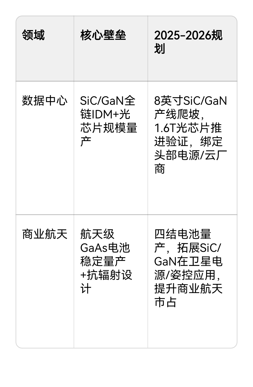 - 2026:1.6T光芯片完成客户验证;8英寸SiC产线规模量产;GaAs电池维持国内商业航天市占率60%+。