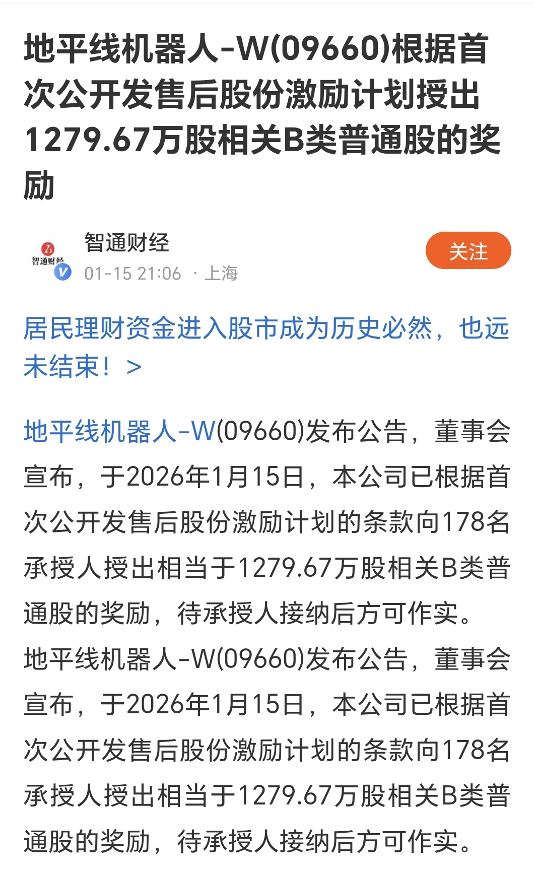 这是地平线(股票代码:9660)在2026年1月15日发布的首次公开发售后股份激励计划授出奖励公告,核心信息如下: