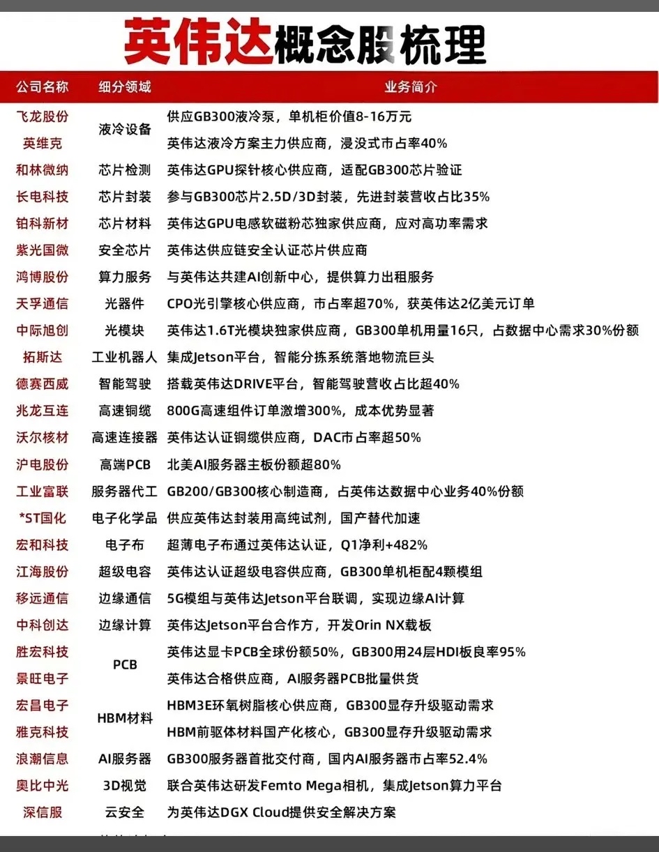 英伟达GB300/GB200系列引爆全球AI算力军备竞赛,一份覆盖超20家A股公司的“英伟达概念股”清单全网刷屏。 但当市场为“沾边就涨”狂欢时,清单中冰冷的业务数据和定语,却揭露了残酷的产业层级:真正能称为英伟达“核心供应链”、享有高确定性订单与技术壁垒的公司,不足三分之一。 投资逻辑已从“炒概念”彻底转向 “验证订单、审视稀缺性、评估业绩弹性” 的三重过滤。