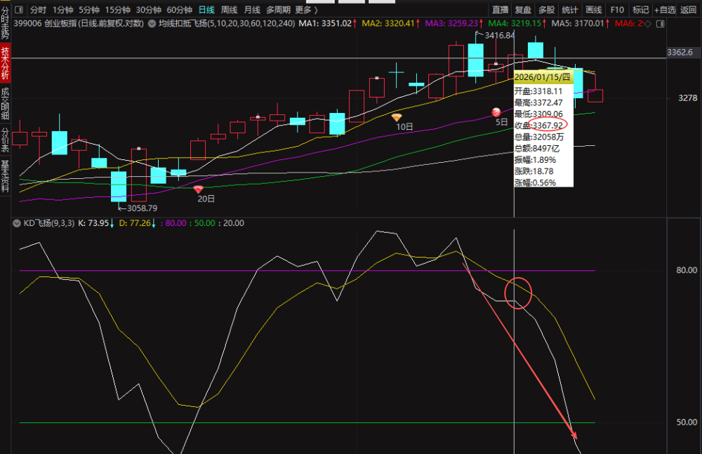创业板日线图的KD指标存在倒鸭嘴,起跌点是3368点,今天已经KD死叉第7天了,会在第9、12反转重新金叉,极限是15天。至少要回到起跌点3368点。