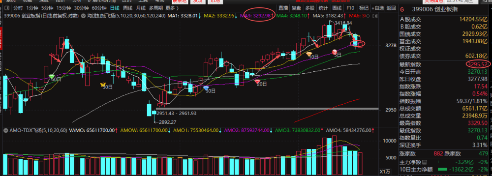 创业板指数收盘3295.52点,收涨0.54%,最高点3329.5点,最低点3270.13点,成交量继续缩量至6561.17亿。