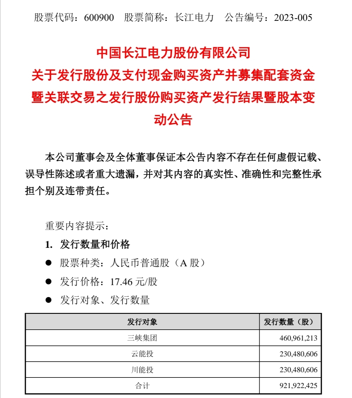 2023年2月8日,长江电力发布收购云川公司的公告,通过“现金(80%)+发行股份(20%)”的方式全资收购云川公司,交易对价804.84亿,发行股份9.22亿股,发行价格17.46元/股,发行对象为三峡集团、云能投和川能投,发行比例为5:2.5:2.5。