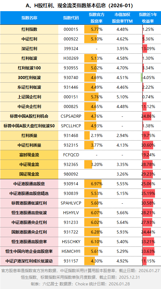在官方口径下,A股11个红利指数的平均股息率约5.03%(除标普),H股8个红利指数约6.02%(除成长低波)。两者差距恰好覆盖了港股分红税(20%)的影响,说明市场定价很充分。