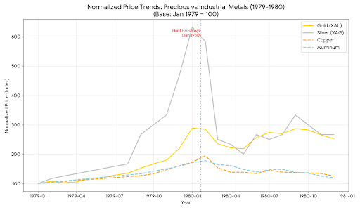 * 第一阶段(1月):亨特兄弟逼空白银,资金集中在“货币属性”最强的金银上疯狂。此时铜铝虽然也涨,但被掩盖了光芒。