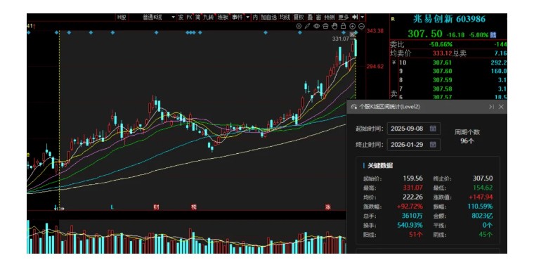 自2025年9月8日本号首次推荐至2026年1月29日创历史新高,兆易创新区间涨幅达92.72%。作为千亿市值级企业,公司股价从起始价159.56元涨至307.50元(收盘价),最高触及331.07元,实现“大象起舞”,彰显市场对其全产业链布局与技术实力的高度认可。