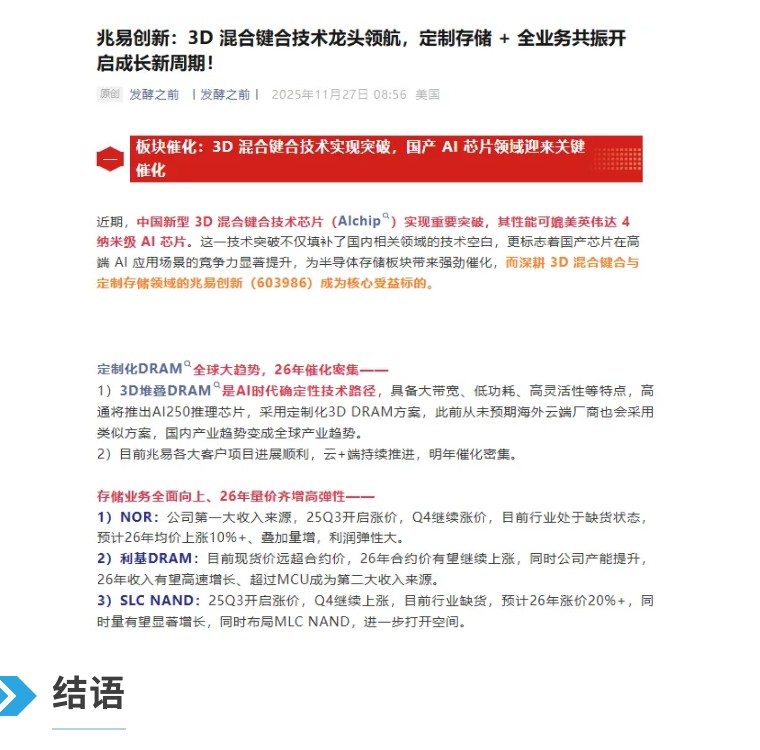 2025年11月27日:本号紧跟3D混合键合技术突破,锁定公司作为核心受益标的,预判2026年NOR、利基DRAM、SLC NAND全产品线量价齐升。