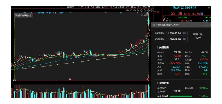 自2025年8月14日本号首次推荐至2026年1月28日创历史新高,斯迪克区间涨幅达125%。2026年1月27日,公司迎来首次20cm涨停,随后持续突破,股价从起始价21.79元攀升至最高55.80元,成为A股磁电存储赛道的标杆标的。