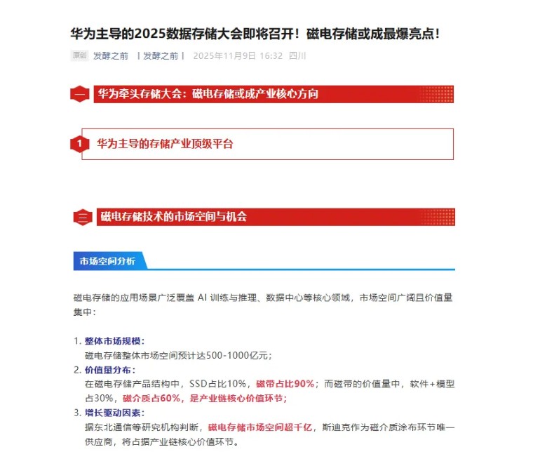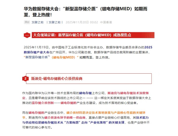 2025年11月20日:本号第一时间跟进华为数据存储大会,强调磁电存储MED技术落地,公司作为核心介质供应商的不可替代性。