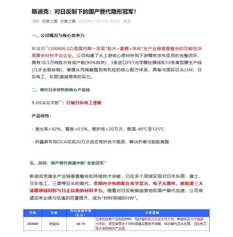 2025年11月17日:本号结合对日反制行情,挖掘公司全产业链整合优势,突出分析其在多领域替代日企的稀缺性,定义“材料领域华为”定位。