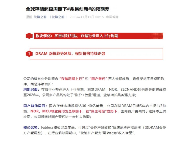 2025年11月11日:本号深度拆解,提出“短期涨价+中期放量+长期定制”三重共振预期,明确公司契合存储周期与国产替代两大趋势。