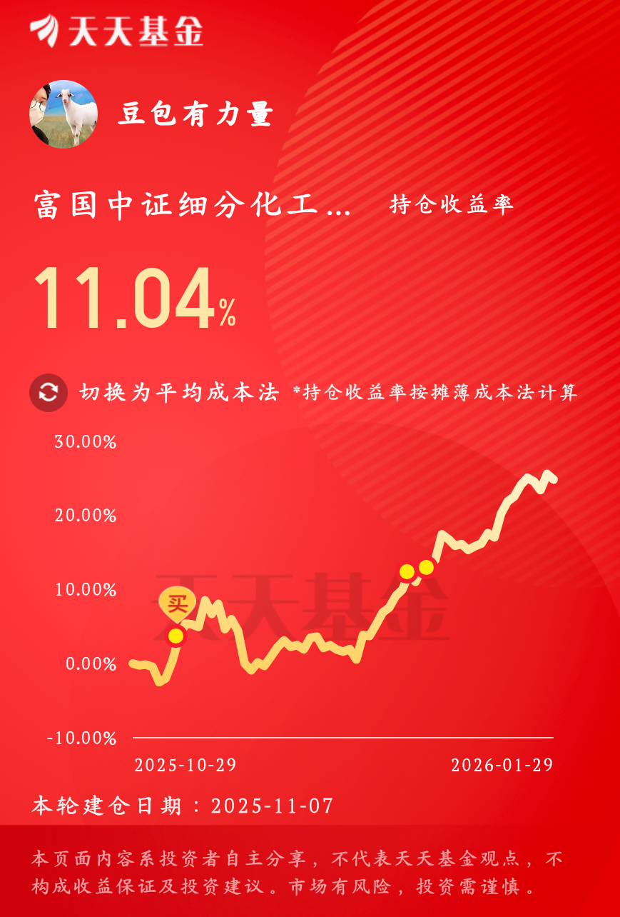 短期这个板块已经涨了一波,股性得到了激活,后续的波段调整,跌得多了大概率都是机会,我到时候也来看情况再补一补,目前布局的$富国中证细分化工产业主题ETF发起式联接C(OTCFUND|020274)$收益还是红的,基金覆盖的万华化学、盐湖股份等股,近几个季度表现都挺好,带着基金近三个月涨了24.80%,近六个月涨了44.91%,近一年涨幅58%,业绩表现强于同类,排名更靠前,今天跌得也不多,就先拿着了。