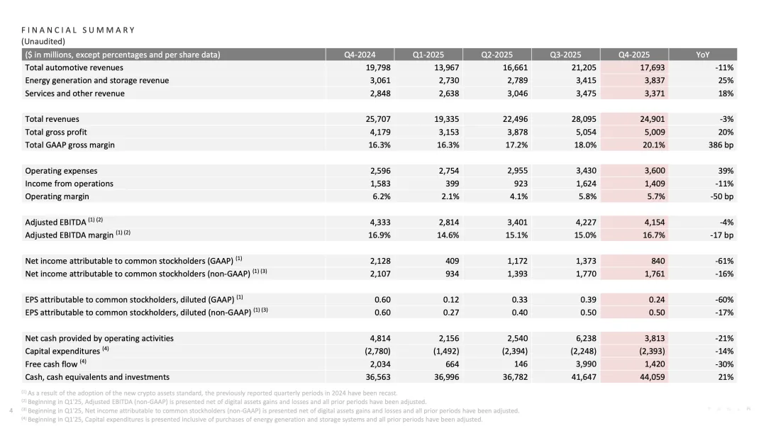 交付量的持续下滑,导致特斯拉全年营收及利润双双下滑。2025 年特斯拉全年营收首次下降,全年 GAAP 净利润更是大跌 46%。