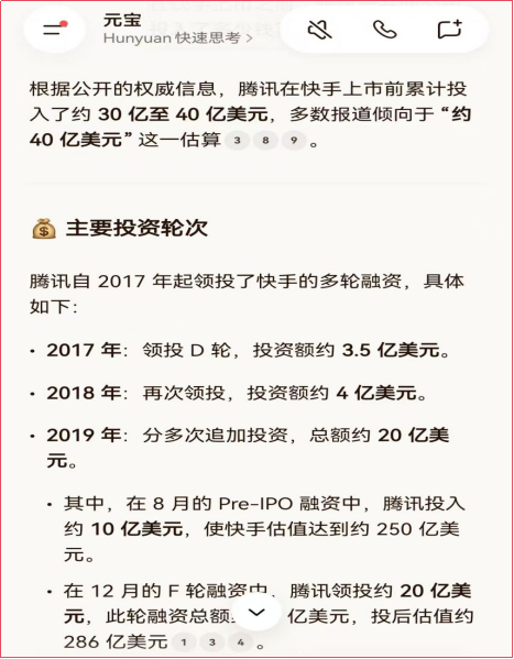 我又问了一下腾讯元宝,在上市之前,腾讯一共向快手提供了40亿美元的股权资本,合计280亿元人民币的弹药。有金主爸爸支持,底气十足啊。