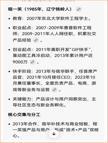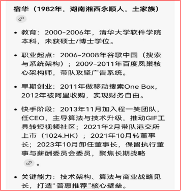 公司的创始人是宿华和程一笑,我问了一下豆包,他们的履历也是非常漂亮的。如果你是风投资本,你看到公司 2013的用户数据,再看看两位创始人的基本履历,上市之前,你大概率会直接掏钱的。