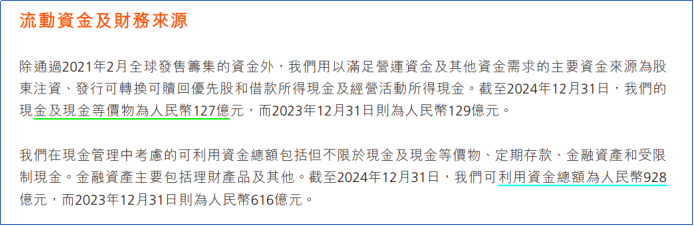 截至2024年12月31日,公司的现金及现金等价物为人民币127亿元,公司可利用资金总额为人民币928 亿元。贷款111亿元。