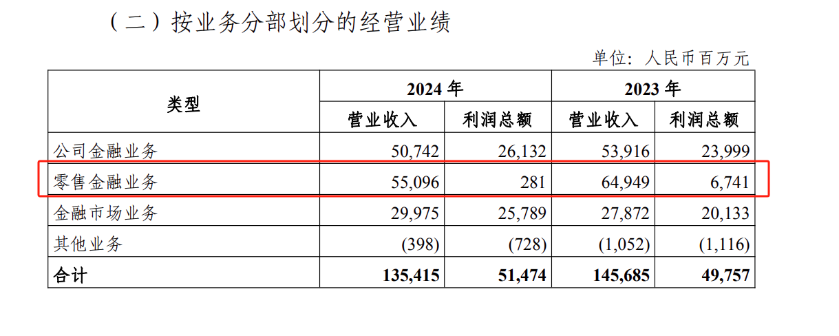 加速零售金融转型一直以来是光大银行的战略重心。数据显示,2022年-2025年上半年,零售金融业务分别实现营业收入659.86亿元、649.49亿元、550.96亿元、255.38亿元,分别实现利润总额为63.58亿元、67.41亿元、2.81亿元和9.21亿元。
