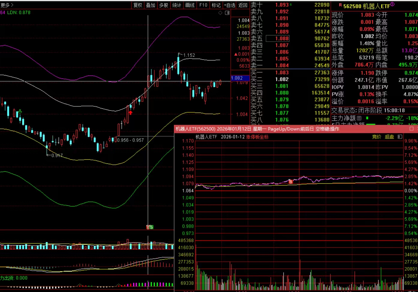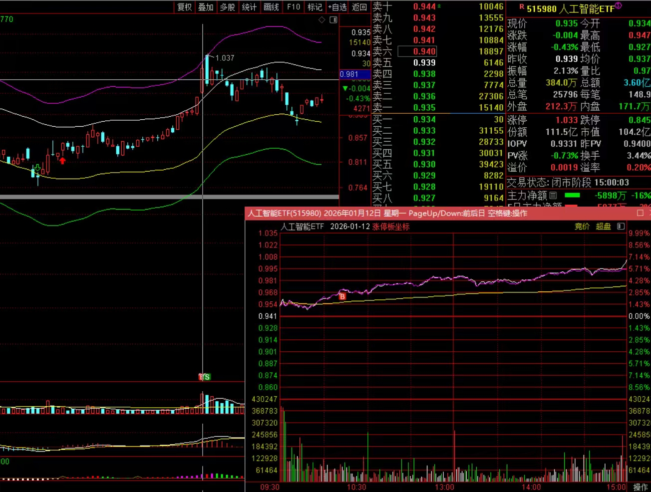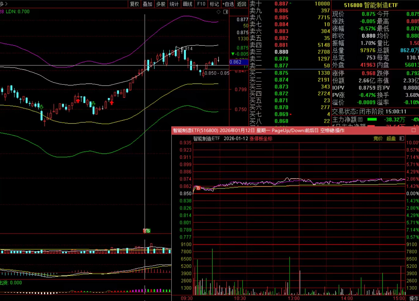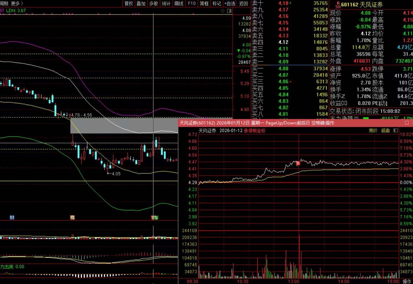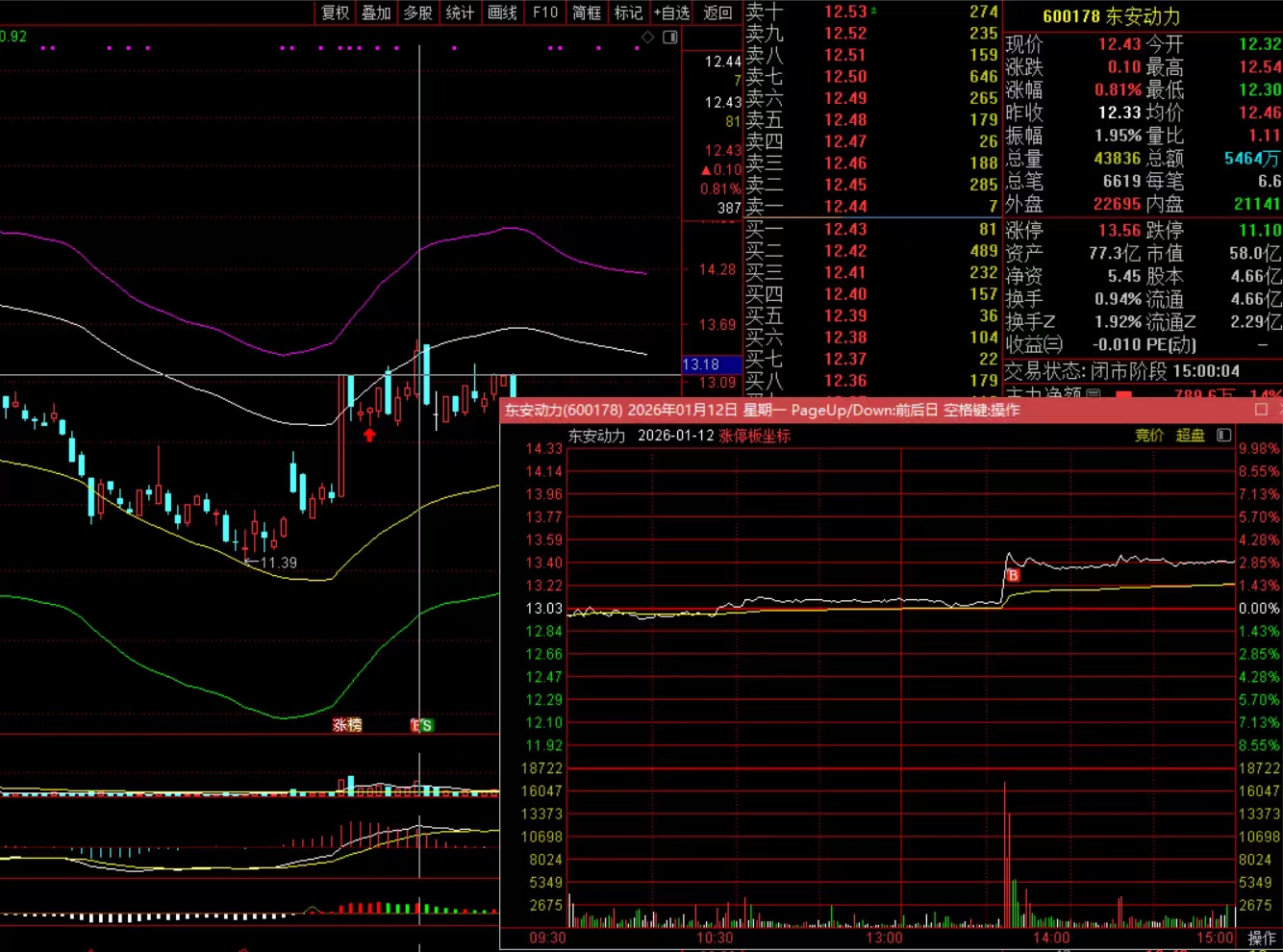 介入逻辑: 1、1月12日从快意电梯出来,早盘1个小时都处于空仓状态,已经明显感觉连板接力行情快到顶了,航天发展,雷科防务,神剑股份,连续高位高换手放量滞涨,AI利欧股份当天加速一字大单,两个大方向都无从下手,这个时候需要调整个人交易模式或者轻仓空仓,由于这段时间整个商业航天太过火爆,好几次错过商业航天前排核心标的,后排又看不上,想着错过就错过,错过就要错过这一轮,就这样犹犹豫豫一直没有上商业航天的车。 2、由于2026年1月12日利欧股份大单一字走加速,最容易上车的就是人工智能ETF,以及锋龙股份,志特新材为代表的机器人ETF方向,智能制造ETF,通信ETF,这几个ETF都在突破创新高,这是个人感觉风偏最小的,整体已经处于防守状态,连续1个多月的连板接力,市场爆量,板块连续高潮,这疯狂背后大家已经盆满钵满的,那接下来后面肯定是要杀人的。 3、既然感觉到了风险即将来临,那就做风偏较小的交易,做ETF,打首板,低吸N字反包潜力标的,2026年1月12日,午后第一时间上车天风证券和半路东安动力,次日全部竞价核按钮离场。