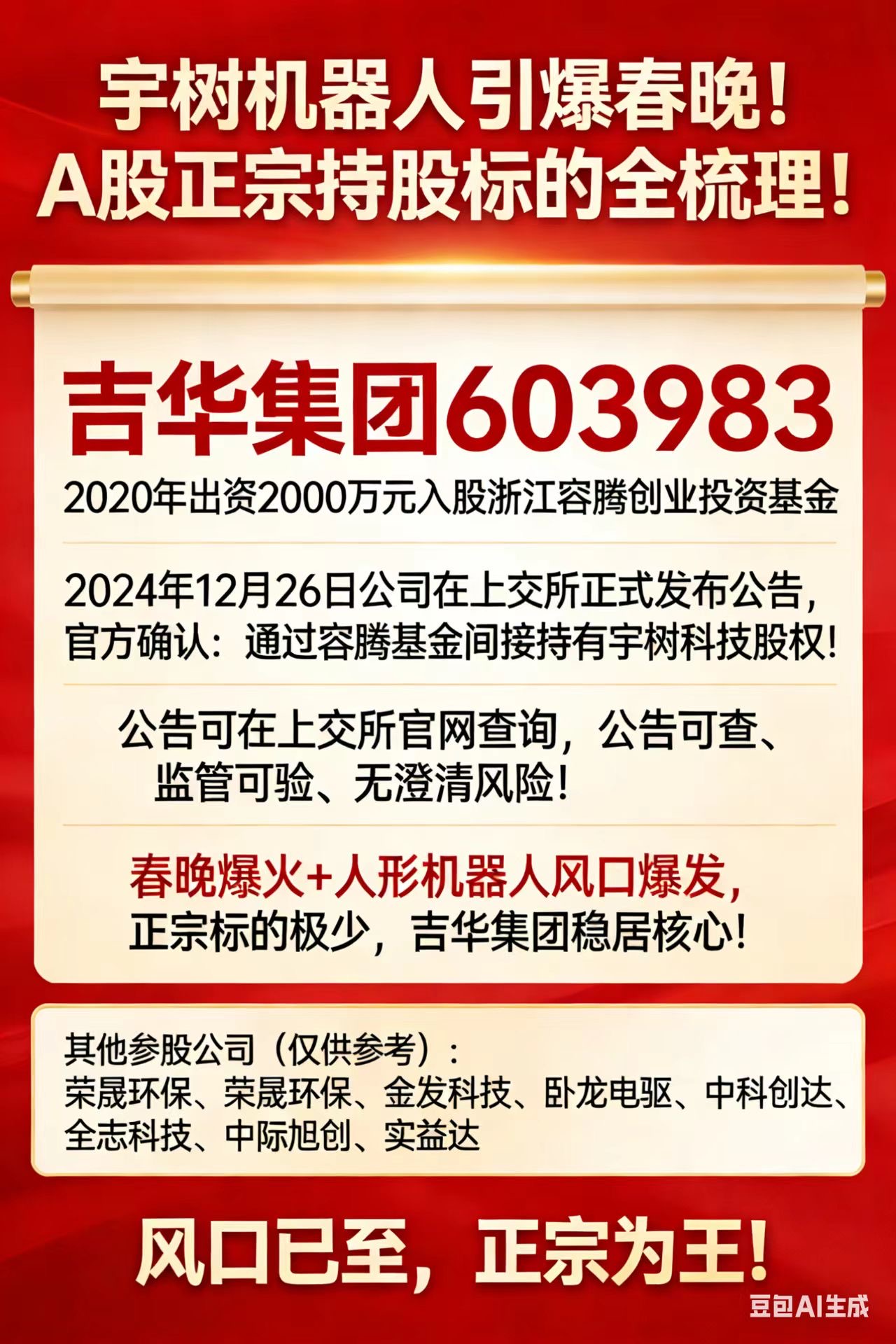 1. 吉华集团:通过浙江容腾创业投资基金间接持有宇树科技股权,公告可查,路径清晰,是市场公认的宇树机器人核心概念股。