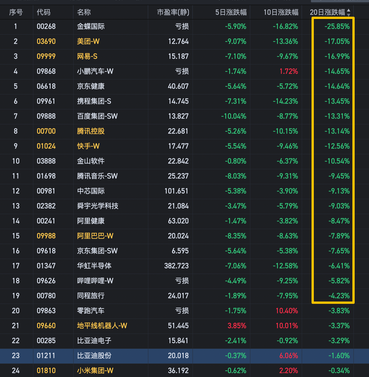 具体到个股上,港股的核心科技股跌的也非常惨啊,腾讯,阿里,美团,百度,过去一个月跌幅都超过10%了。这里我汇总了下过去20个交易日的跌幅,一看吓一跳啊!