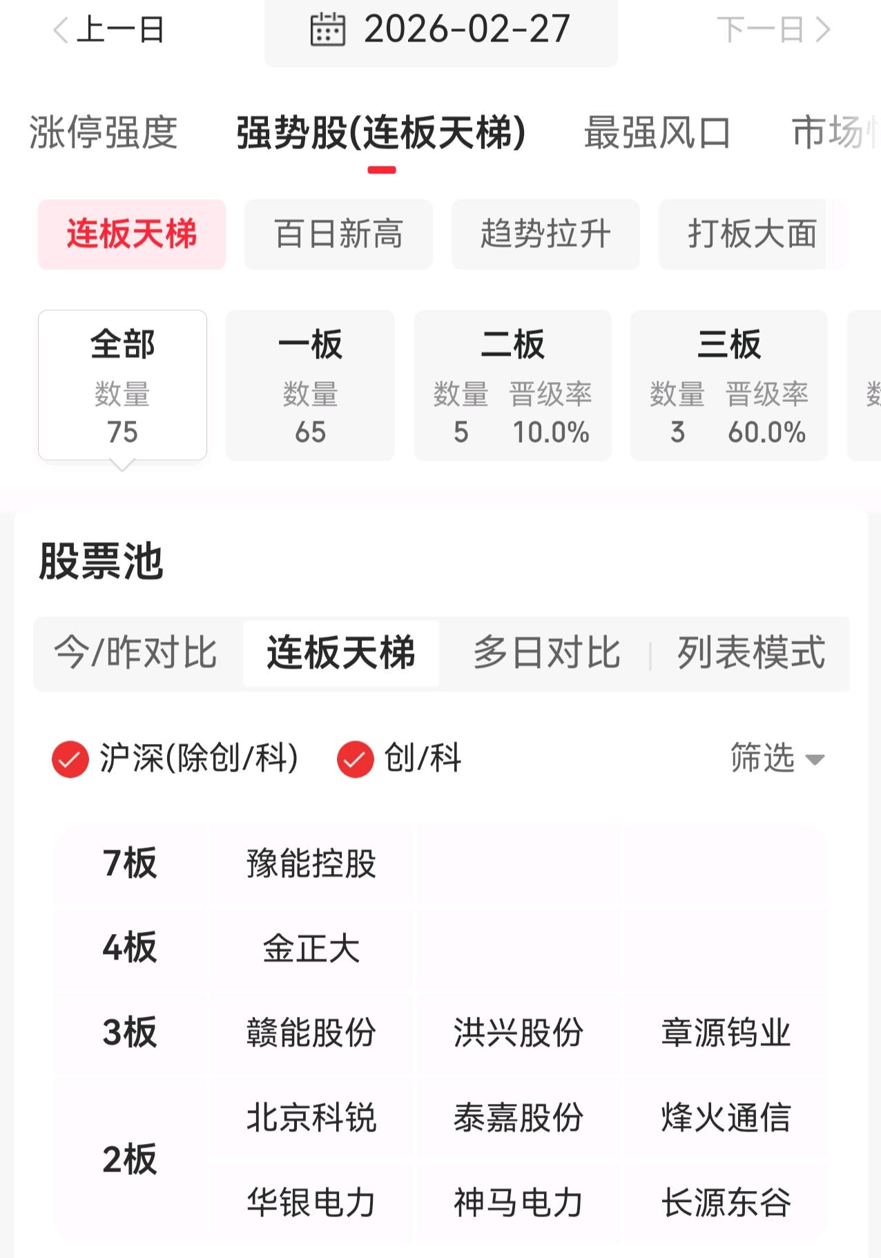 2月27日A股震荡分化,沪指收涨、创业板回调,两市成交额约2.54万亿,市场高位整固、题材轮动极快,短线操作难度大增。盘面小金属、煤炭、电力领涨,AI硬件、芯片集体调整,资金套利明显,板块多为一日游。竞价上中国天楹、章源钨业超预期,化工板块整体不及预期;连板高度达7板,但中位股普遍掉队,高标挤兑效应突出。个人操作上,买入钧达股份、御银股份、直真科技,部分标的遇骗炮;卖出海翔药业、翔鹭钨业、北京科锐,出现卖飞情况。当前市场无主线、量能未持续放大,指数背离,明日将观望周末消息面,控仓等待方向明朗。