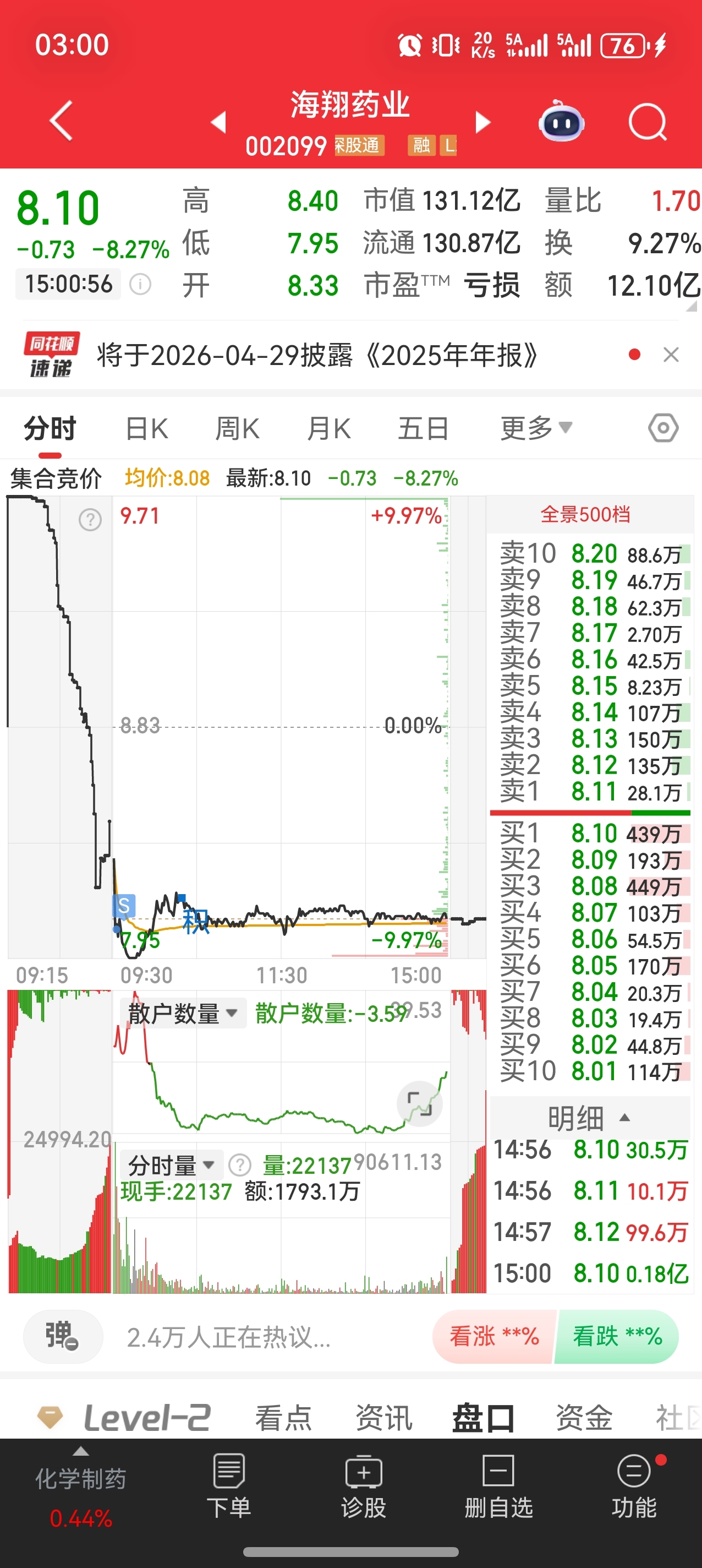 海翔药业:昨天硬板,没有任何利空情况下今天直接按地板,主力有毛病啊?