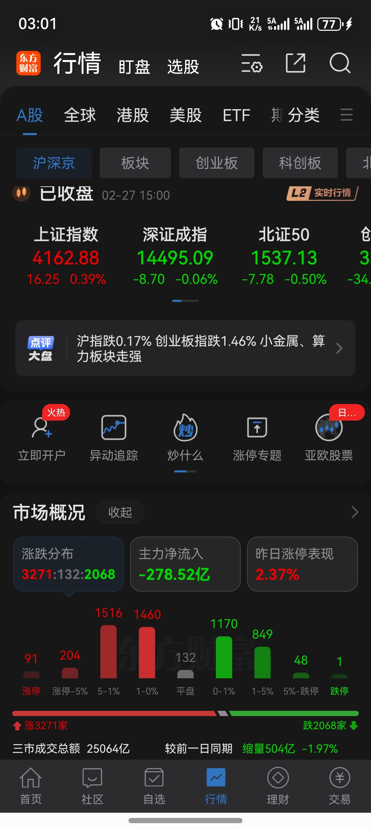 2月27日A股震荡分化、企稳收涨。沪指收4162.88点,涨0.39%,深成指、创业板小幅回调,指数强弱分化明显。两市成交额约2.54万亿元,量能维持活跃,个股涨多跌少,市场情绪保持稳健。盘面呈高位整固、结构轮动格局。早盘低开后依托5日均线快速回升,金融、有色、电子通信等板块发力护盘,资金弃高就低,低位蓝筹与硬核科技更受青睐,高位题材股有所分化。技术面,沪指短期支撑4120-4130点有效,上方4180点附近存在压力,震荡消化获利盘为主。操作建议不追高,聚焦业绩与政策主线,控仓参与轮动,耐心等待方向明朗。