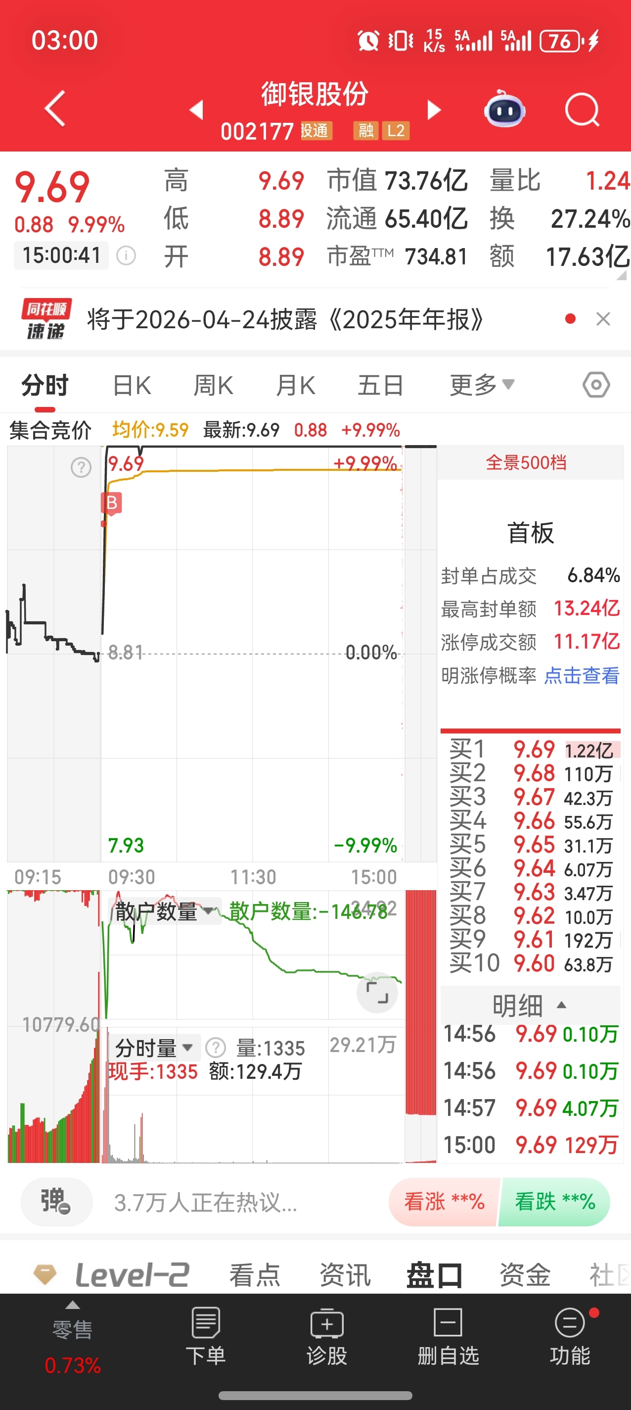 御银股份:格尔软件一字板,资金做了御银股份,半路上车。