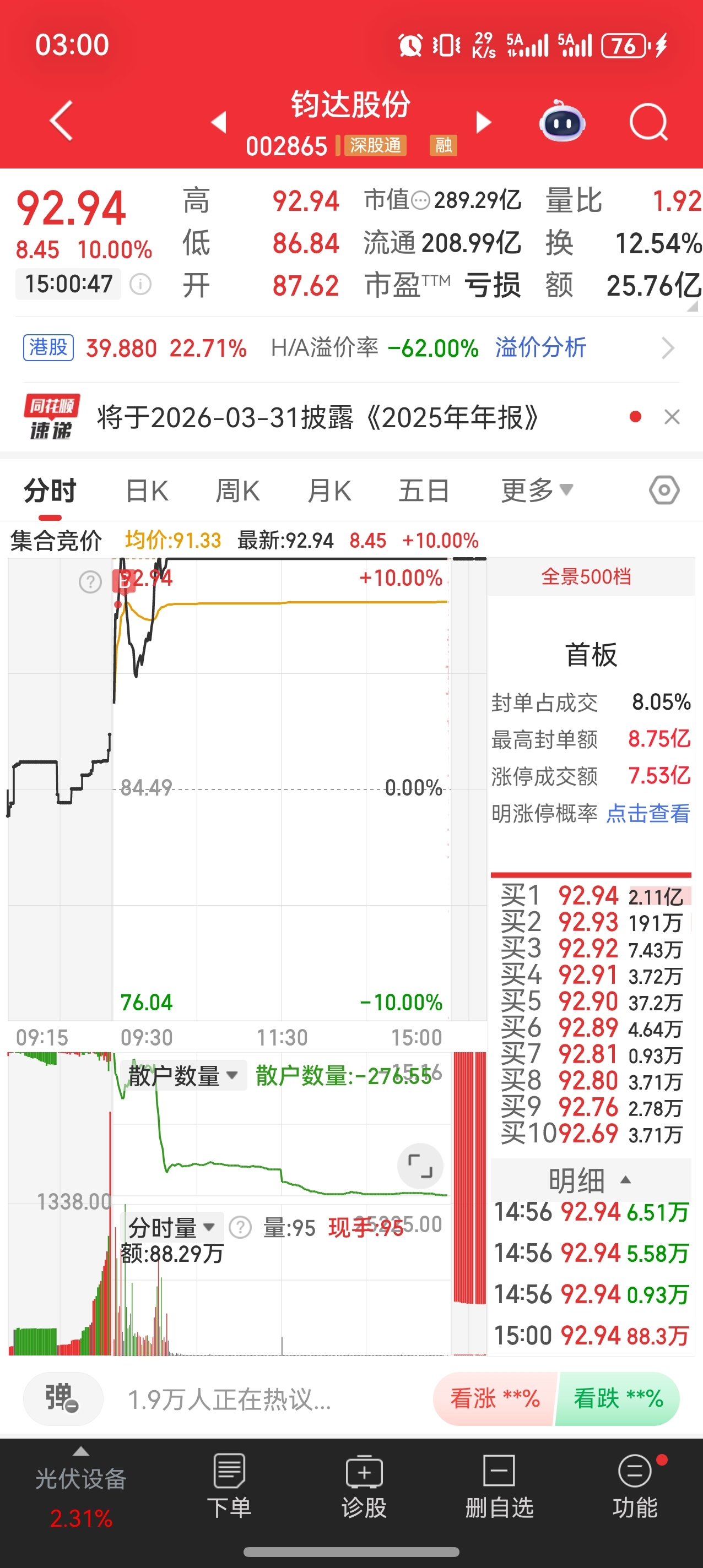 钧达股份:早上绿电竞价超预期,光伏也属于电力细分,钧达股份抢筹高开,半路上车,实际上筹码结构不好。