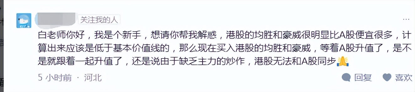 那边发行的市值太小,就是一个小盘股而已,筹码安定程度不如A股这边,比如今天均胜港股,涨了4%,A股这边没啥反应,成交金额不到A股这边20%,也就是说,随便一点市场投机资金,短线想怎么弄怎么弄(相对流动性远差于A股)
