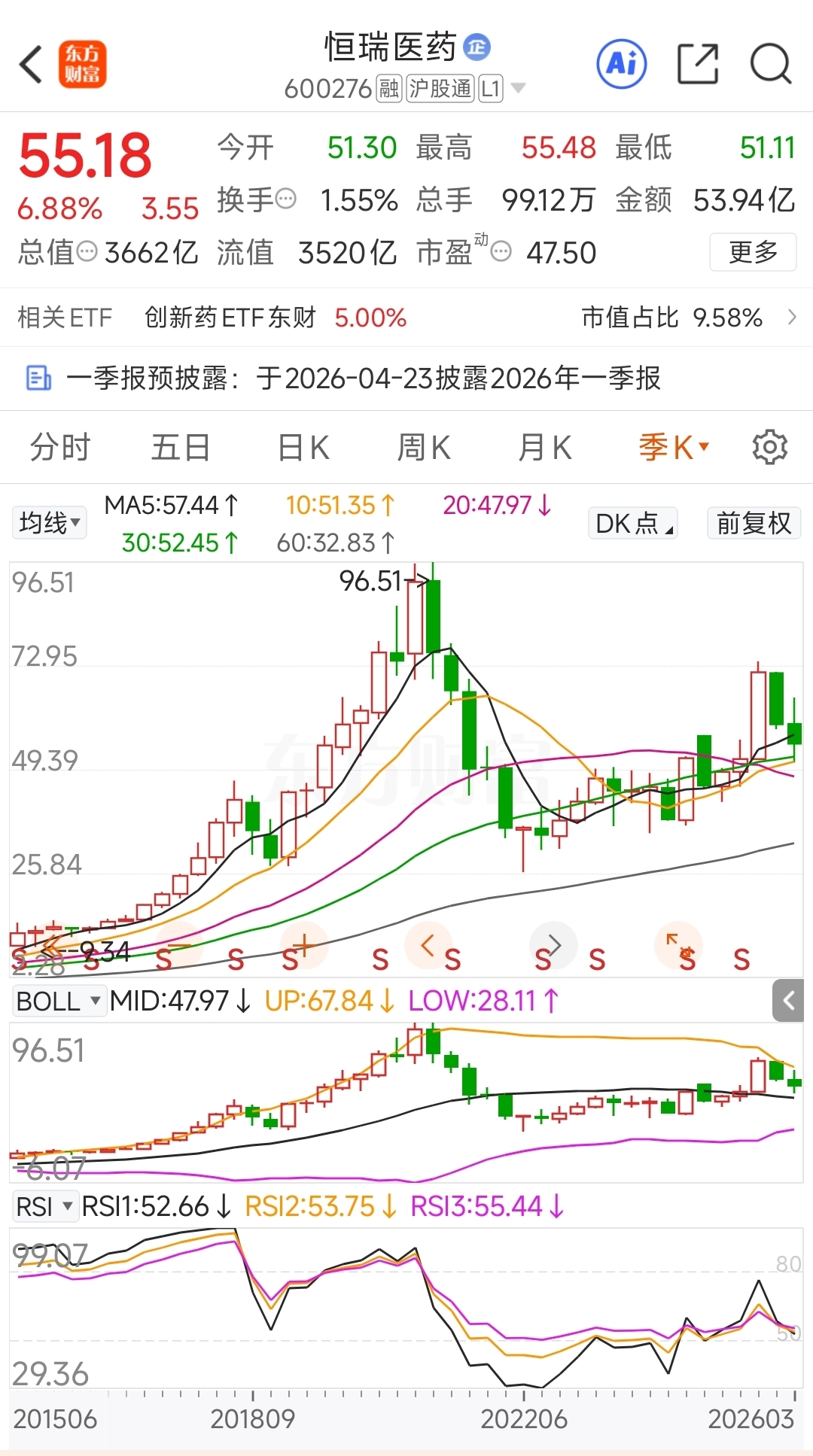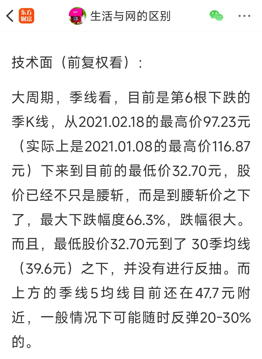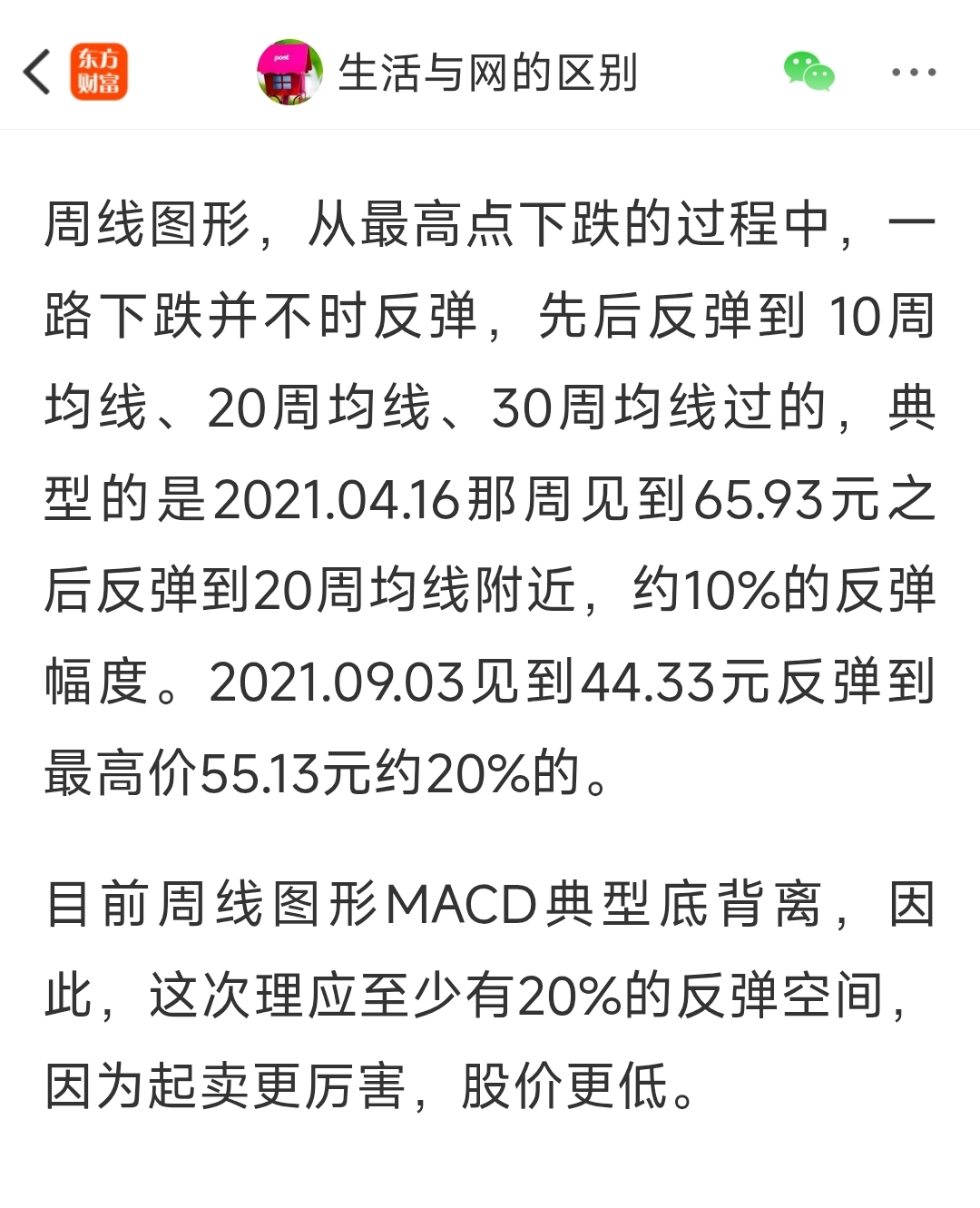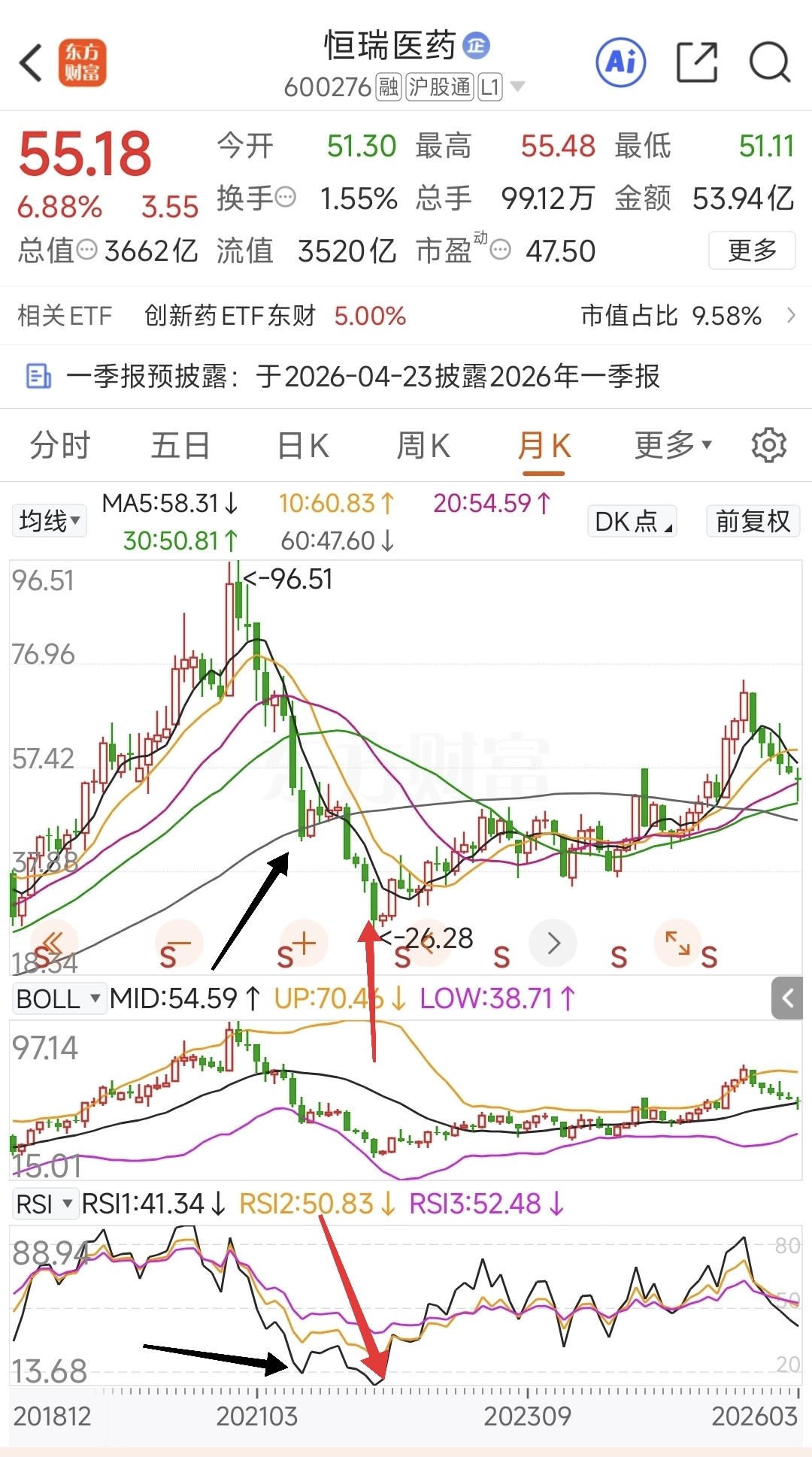 红色的箭头处是2022年4月。图形中的特点是红色的箭头之前连续下跌、大跌,黑色的箭头处是 60月均线、RSI 第一次相对低位,小幅反弹震荡5个月后破位继续大跌,直到RSI 的二次相对低位。当时的业绩预期不好、股市处于悲观氛围中,特地公开的写了止跌反弹抄底的帖子。