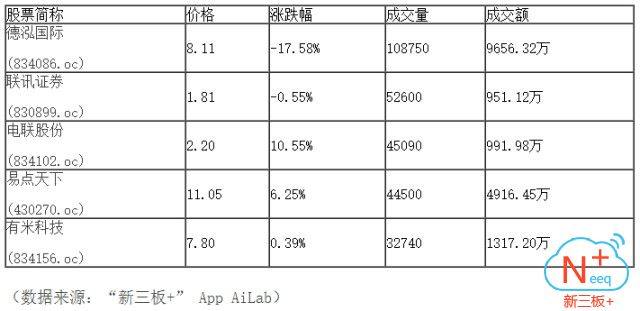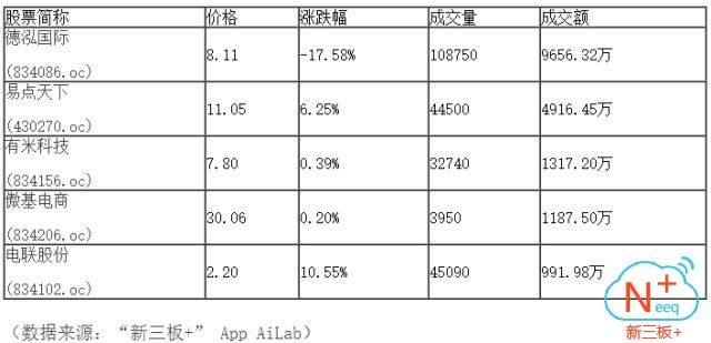 4、创新层活跃股成交额方面,德泓国际成交9656.32万元位居榜首,易点天下 成交4916.45万元位列第二;有米科技成交1317.20万元位列第三; 排名第四和第五的分别是傲基电商和电联股份。