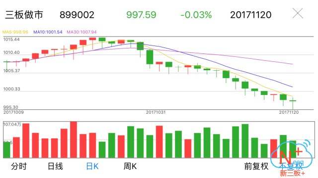 6、做市指数今以997.84点开盘后下跌,下午稍有回升未翻红,最低跌至995.29后回升,截至收盘,三板做市指数报收997.41点,跌0.51点,跌幅0.05%。
