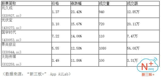 7、做市交易排行榜中,兆久成以23.42%领涨做市交易;光伏宝涨幅15.67%位列第二; 排名第三的是国学时代,涨幅14.06%;排名第四和第五的分别是景尚旅业和太阳传媒。