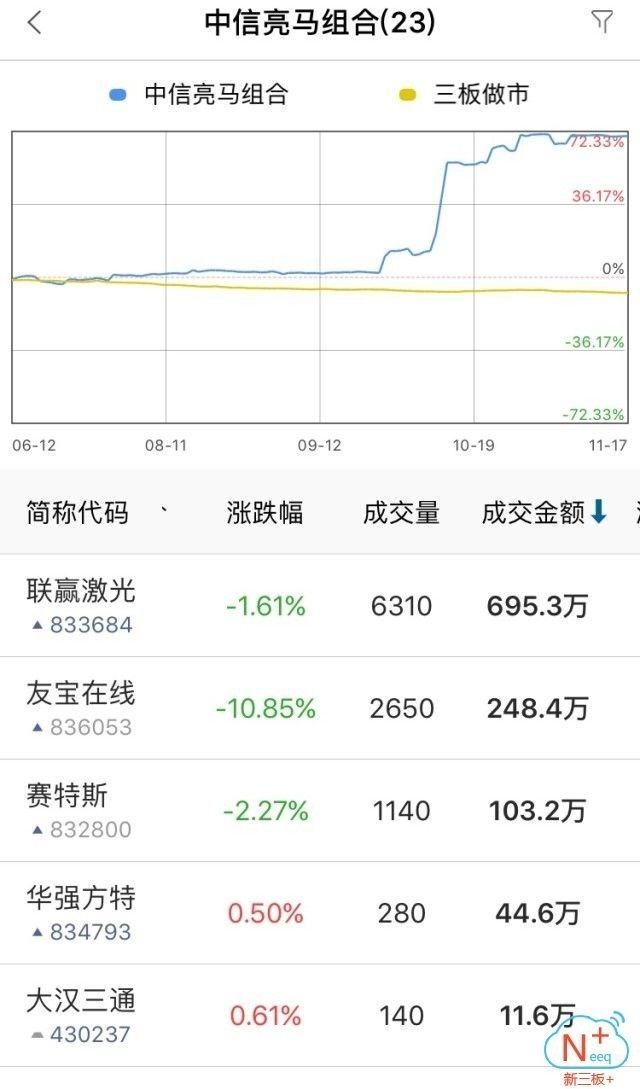 1、据“新三板+”三十主题概念板块之一“中信亮马组合”显示,联赢激光成交695.3万元位居首位;友宝在线成交248.4万元位居第二,赛特斯光成交103.2万元位列第三。