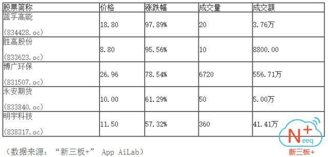 2、1366家创新层涨幅榜中,蓝孚高能以97.89%领涨创新层; 胜高股份涨幅95.56%位列第二;第三名是博广环保,涨幅78.54%; 位列第四和第五的分别是永安期货和明宇科技。