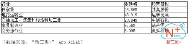 9、行业涨幅排行榜中,住宿业以涨幅95.56%荣登行业榜首,其他表现强劲的行业还有道路运输业、石油加工、炼焦和核燃料加工业、家具制造业和商务服务业等。