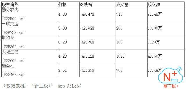 3、创新层跌幅榜上,勤劳农夫领跌,跌幅-49.47%;三联交通跌幅-48.93%位列第二; 第三名为斯特龙,跌幅为-48.76%;大地生物跌幅-47.12%排名第四; 排名第五的是盛盈汇跌幅-41.35%。