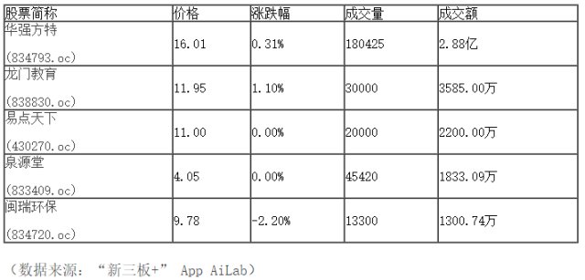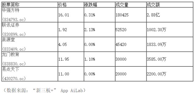5、创新层活跃股成交量方面,华强方特成交180425手居于首位;联讯证券以52520手位列其次; 泉源堂以45420手排名第三;第四为龙门教育,成交30000手; 排名第五的是易点天下,成交20000手。