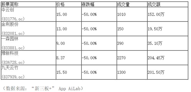 3、创新层跌幅榜上,中云创、金利股份、一森园林、豫新科技、九天云竹跌幅均为-50.00%。