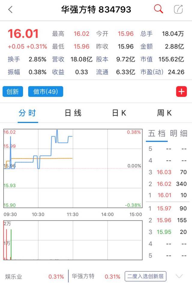 华强方特今日开盘后成交不断,在短短半个小时内成交额达到2.87亿,截止午间收盘,股价为16.01元,上涨0.05元,涨幅0.21%。公司有49家做市商,位于创新层历史交易较为频繁。