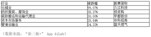 9、行业涨幅排行榜中,仓储业以涨幅99.07%荣登行业榜首,其他表现强劲的行业还有纺织服装、服饰业、装卸搬运和运输代理业、资本市场服务和管道运输业等。