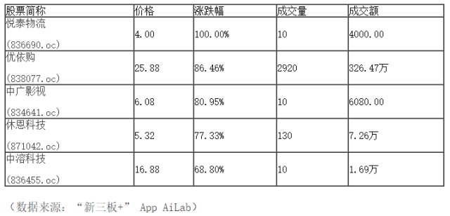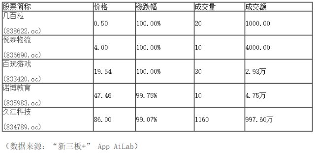 8、协议转让排行榜中,几百粒、悦泰物流、百玩游戏涨幅均为100.00%;第四和第五分别是诺博教育和久江科技。