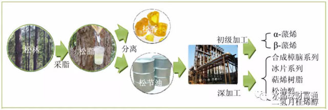 公司主要从事松节油深加工系列产品的研发、生产与销售,即以松节油为主要原料,通过化学加工方法生产合成樟脑系列产品、冰片系列产品、香精香料等精细化工产品。合成樟脑系列产品主要包括:合成樟脑、异龙脑、乙酸异龙脑酯、莰烯、双戊烯、醋酸钠等;冰片系列产品主要包括:冰片、小茴香油等;香精香料主要包括:月桂烯、龙涎酮和乙酸苄酯。松节油深加工技术路线: