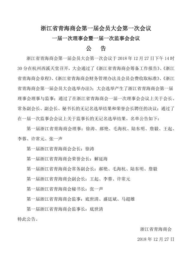 -----浙江省青海商会第一届会员大会第一次会议一届一次理事会暨一届一次监事会会议