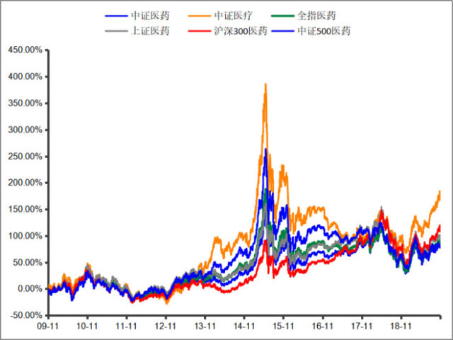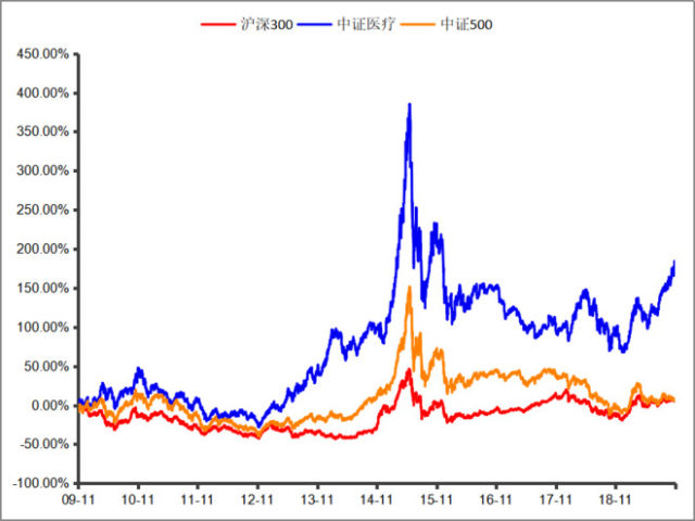 2009.11.22-2019.11.22,中证医疗指数在10年左右中相对沪深300和中证500的累计超额收益率分别为174.05%、171.47%,年化超额收益分别达11.38%、9.22%。
