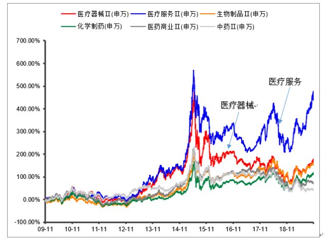医疗行业作为医药行业的一个细分行业,过去10年医疗指数具有高收益、高弹性的特点。按最近11年统计,中证医疗指数有8年跑赢了中证医药指数,医疗板块明显好于医药行业其他子板块。